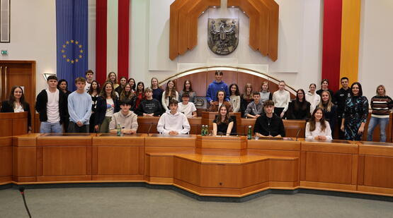 LT-Präsidentin Astrid Eisenkopf begrüßte die Jugendlichen im Landtag /…