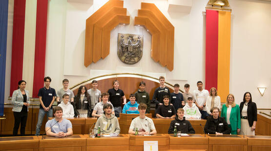 LT-Präsidentin Astrid Eisenkopf begrüßte die Jugendlichen im Landtag /…