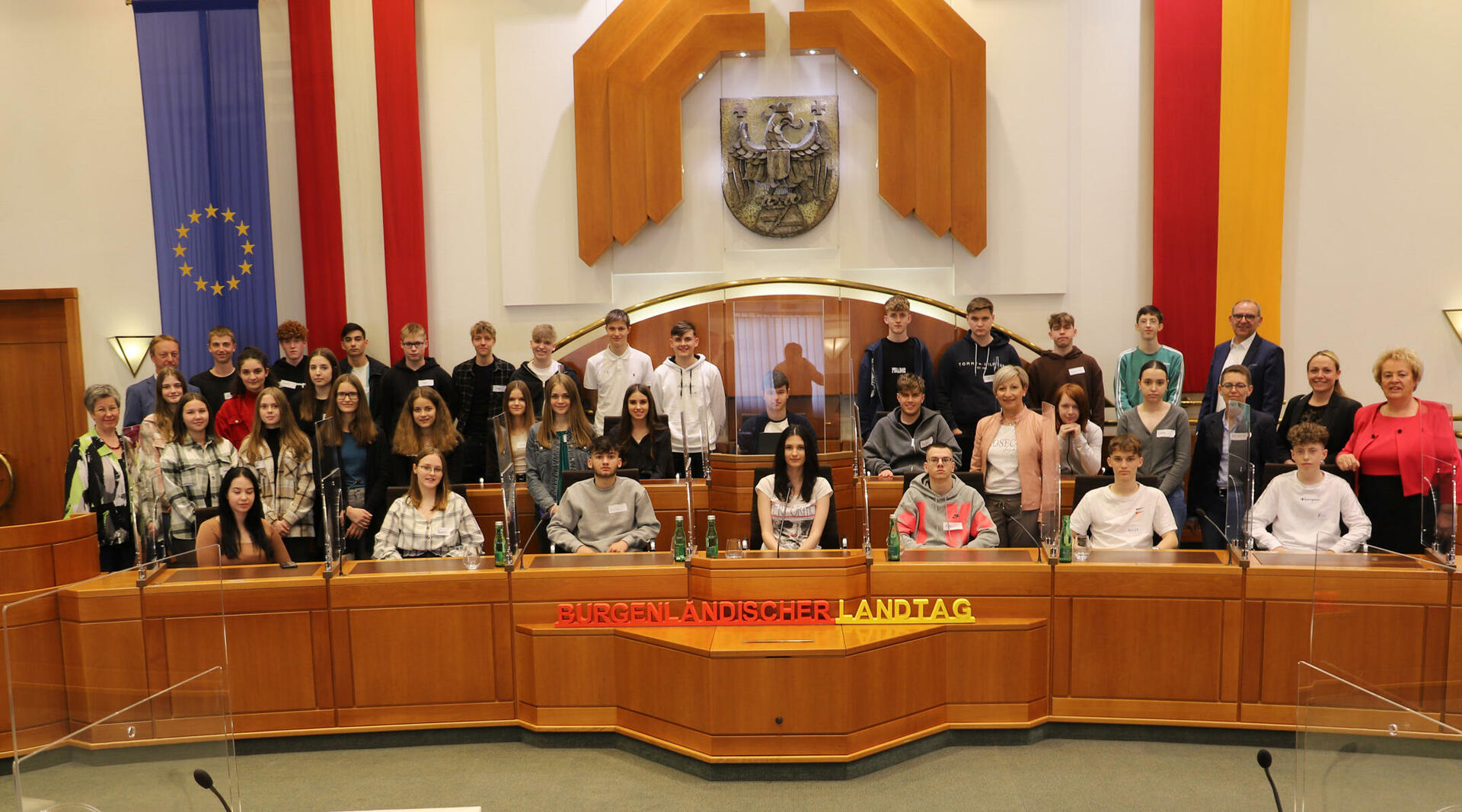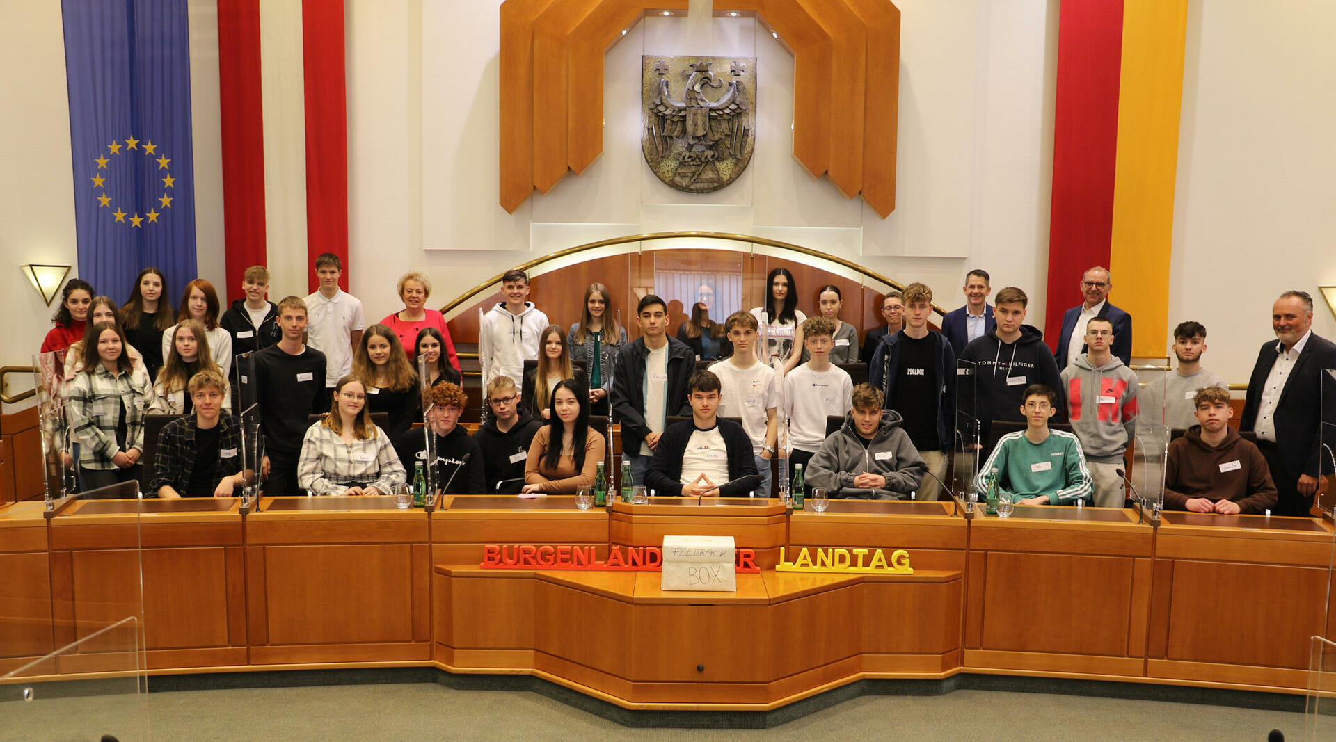 Landtagspräsidentin Verena Dunst mit den Schülerinnen und Schülern der HAK Mattersburg sowie ihrem Direktor Prof. Mag. Andreas Hackstock und Prof.in Mag.a Gabriele Hamp-Levonyak sowie den Vertreterinnen des Landtages, Claudia Schlager, Mag.a Regina Petrik, Johann Tschürtz und DI Julia Wagentristl BSc.