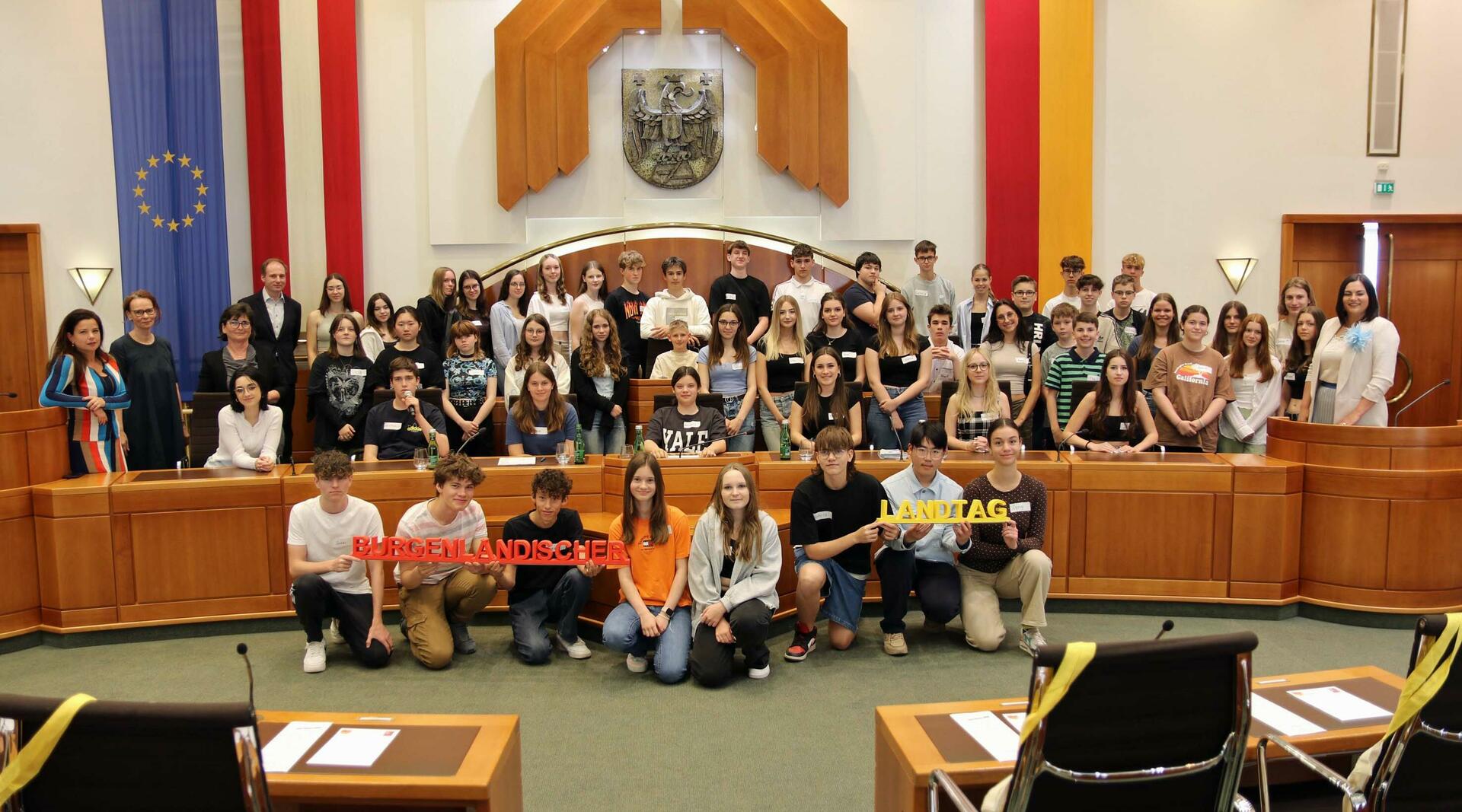 Jugendliche für die politische Arbeit im Burgenland zu begeistern und sie zum Mitreden und Mitgestalten zu animieren, hat sich das Projekt „Jugend im Landtag“ zum Ziel gesetzt. Im Rahmen der von Landtagspräsidentin Verena Dunst initiierten Demokratieoffensive fanden sich heute, Donnerstag, 1. Juni 2023, 56 Schülerinnen und Schüler der 6. bis 10. Schulstufe des Gymnasiums Wolfgarten Eisenstadt mit Direktorin Mag.a Andrea Berger-Gruber, Administratorin Mag.a Ulrike Klein-Schweifer und Mag. Harald Strassl im Landhaus ein, um mit politischen Entscheidungsträgerinnen und Entscheidungsträgern über ihre Themen und Anliegen zu diskutieren.