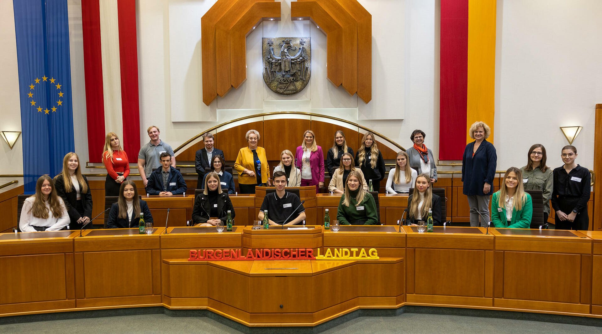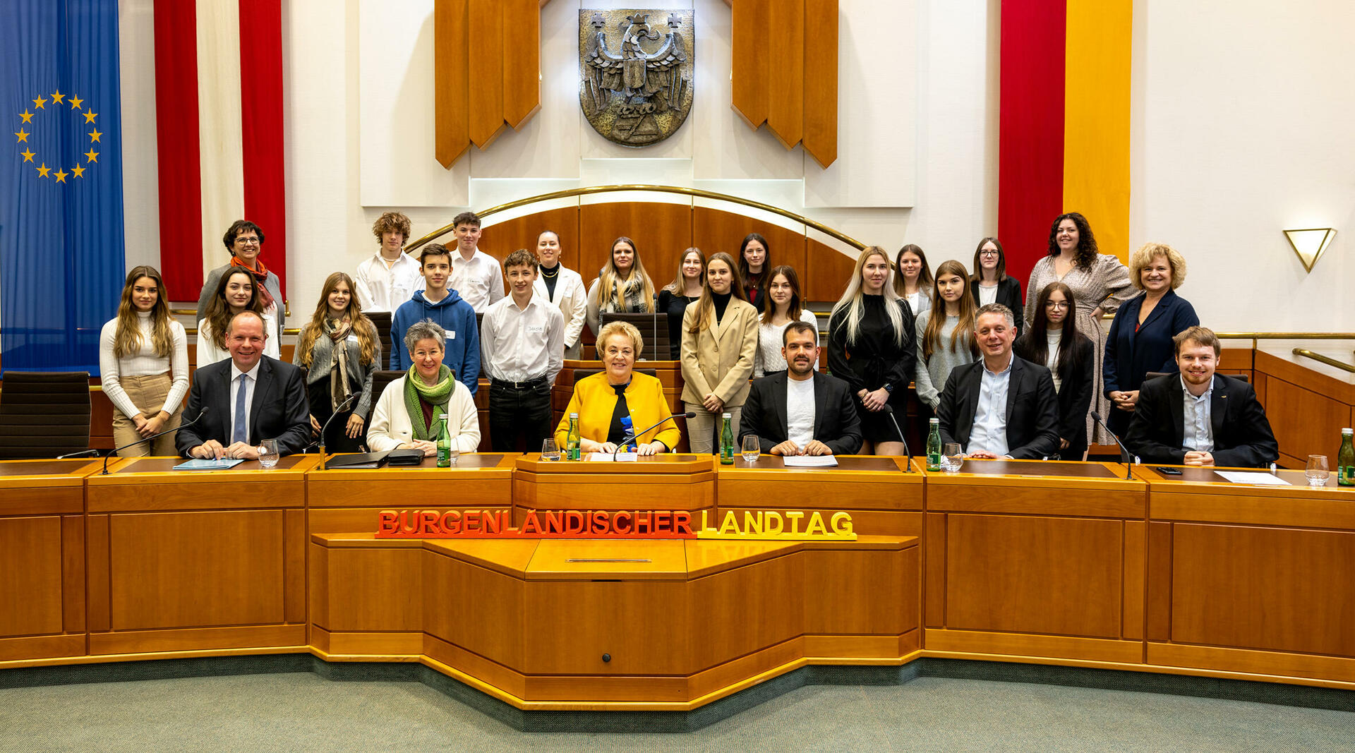 in der ersten Reihe: Landtagspräsidentin Verena Dunst (3.v.l.) und die Landtagsabgeordneten (v.l.) Johannes Mezgolits, Klubobfrau Mag.a Regina Petrik, Kilian Brandstätter (4.v.l.), MMag. Alexander Petschnig (5.v.l.) und Jonathan Dorner mit SchülerInnen der 4. Klasse und Lehrkräften des Pannoneums Neusiedl am See.