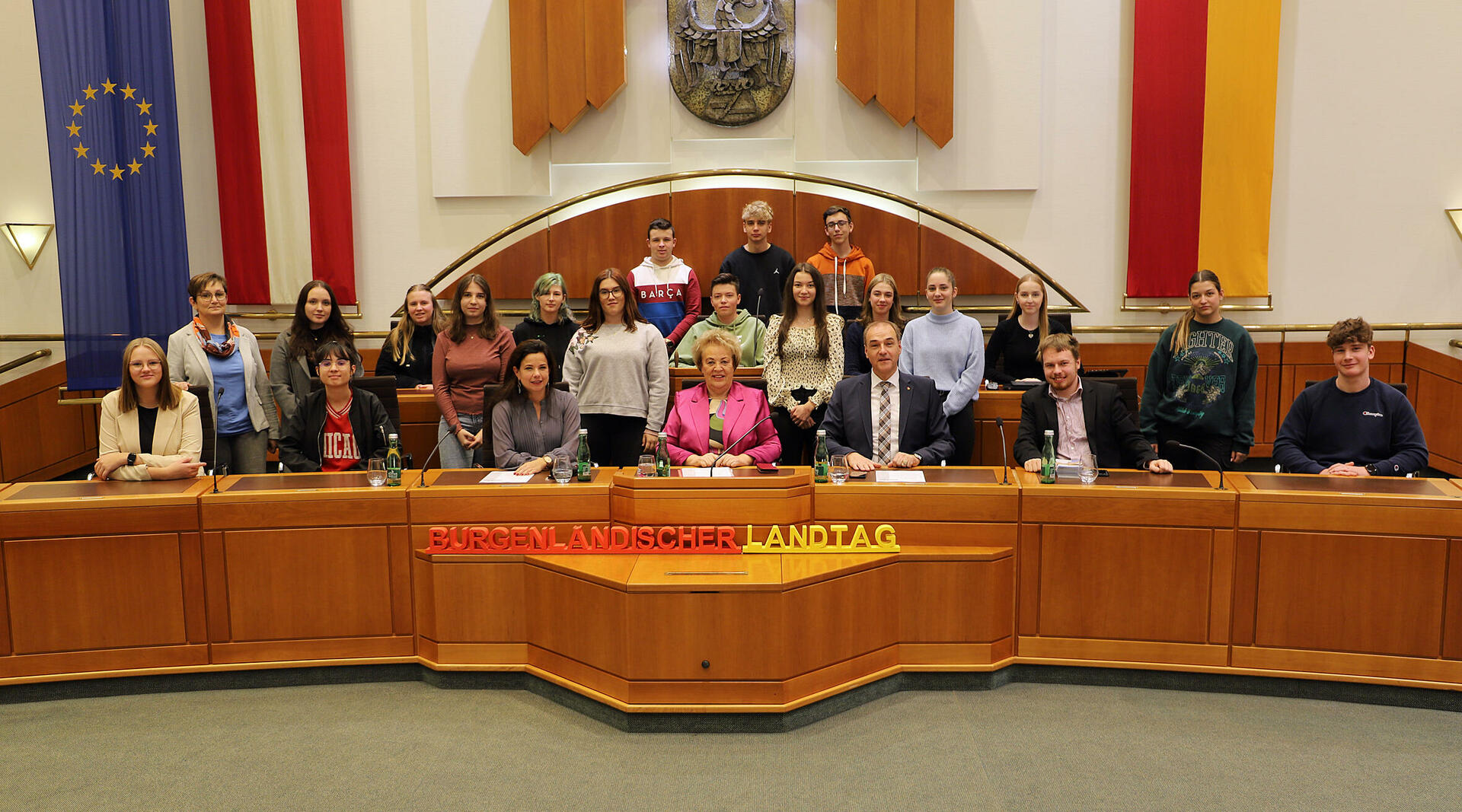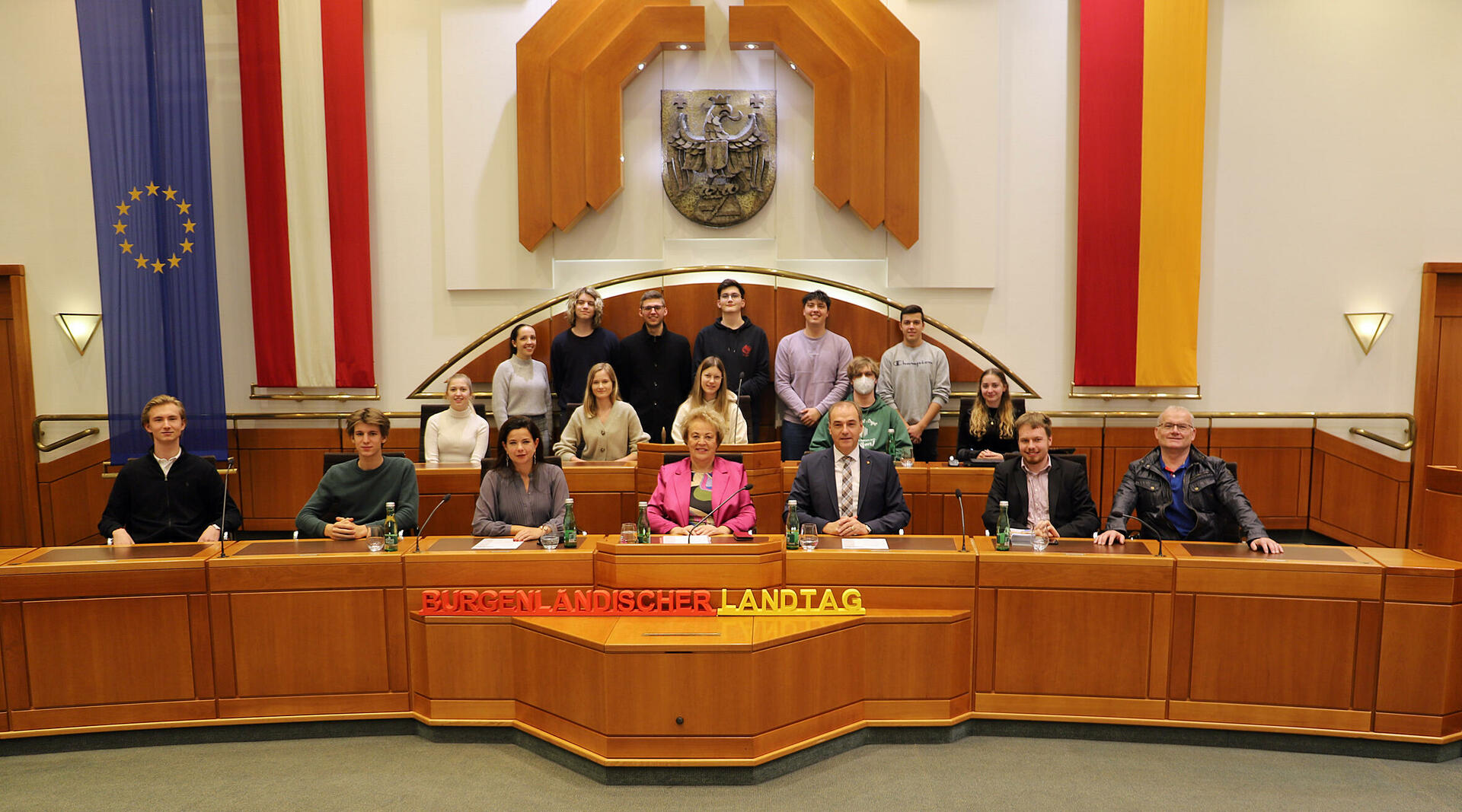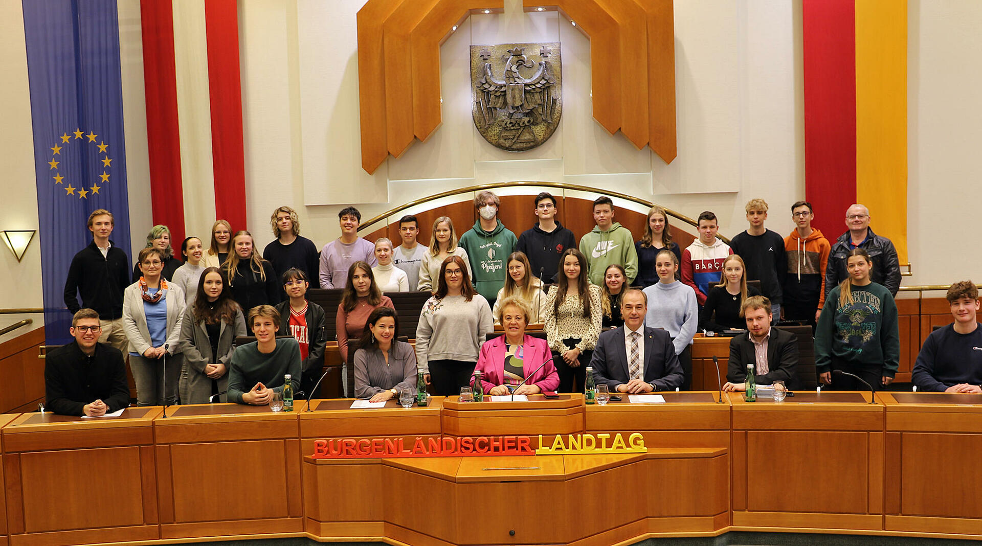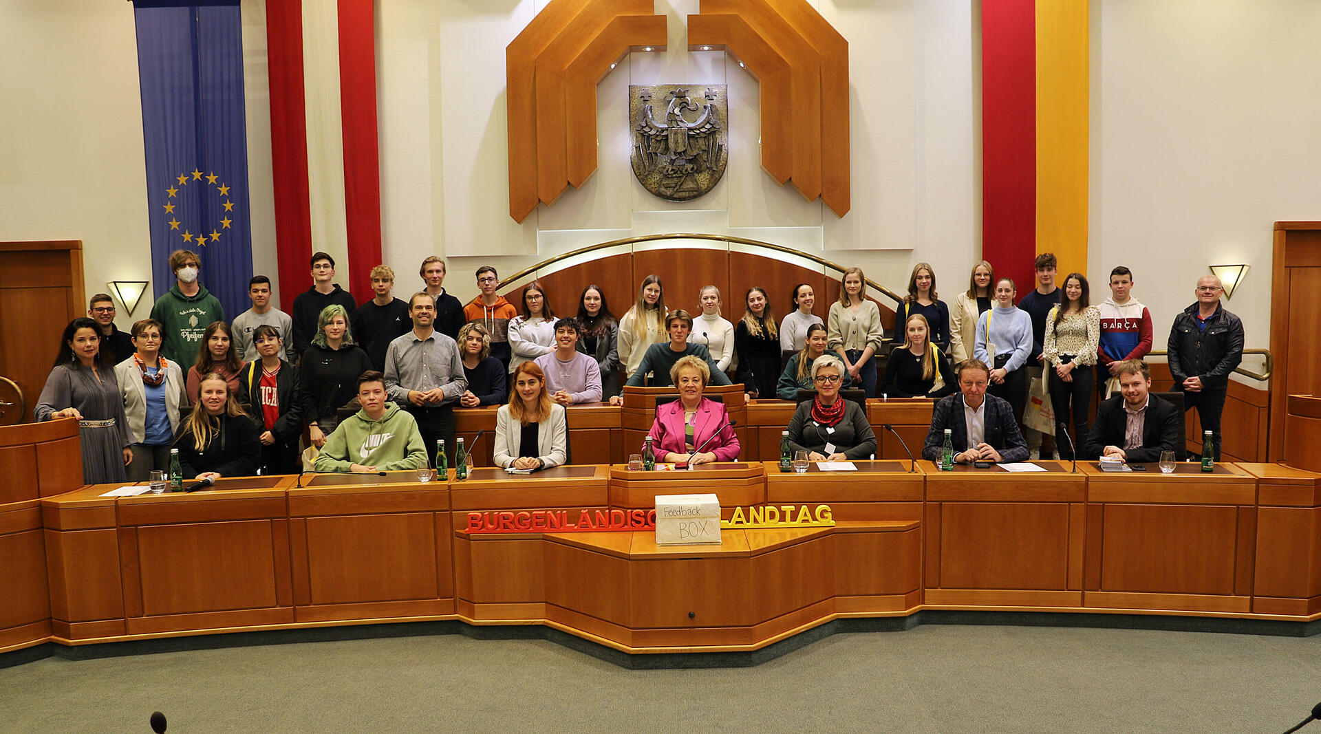 Zum Mitreden und Mitgestalten: Dazu werden Jugendliche im Rahmen des Projekts „Jugend im Landtag“, der Demokratieoffensive von Landtagspräsidentin Verena Dunst, eingeladen und für die politische Arbeit im Burgenland begeistert. 38 Schülerinnen und Schüler der 7.a Klasse POP- und KOM-Zweig sowie die 8.M des Musikgymnasiums des Wimmer Gymnasiums Oberschützens fanden sich heute, Dienstag, am 8. November 2022, im Landhaus mit Lehrerin Professorin Bettina Koller sowie Professor Andreas Zapfl ein, um ihre eigenen Themen und Anliegen mit politischen Entscheidungsträgerinnen und Entscheidungsträgern zu diskutieren. Dabei stand Landesrat Dr. Leonhard Schneemann den Jugendlichen eine Stunde lang Rede und Antwort. Durch eine zweite Fragerunde mit den Landtagsabgeordneten Doris Prohaska, Dipl. Päd. DI Carina Laschober-Luif, Johann Tschürtz und Wolfgang führte DDr. Barbara Glück, die Leiterin der KZ-Gedenkstätte Mauthausen. Mit dabei war der „Auslandsdiener des Jahres 2020" des Österreichischen Auslandsdienstes, Jonathan Dorner. Für Landesrat Dr. Leonhard Schneemann war es eine besondere Freude, den Jugendlichen Rede und Antwort zu stehen: "Als gelernter Wirtschaftspädagoge habe ich mich schon früh in der Politik eingebracht. Es ist wichtig, sich in der Demokratie einzubinden, um mitgestalten zu können", so Schneemann.