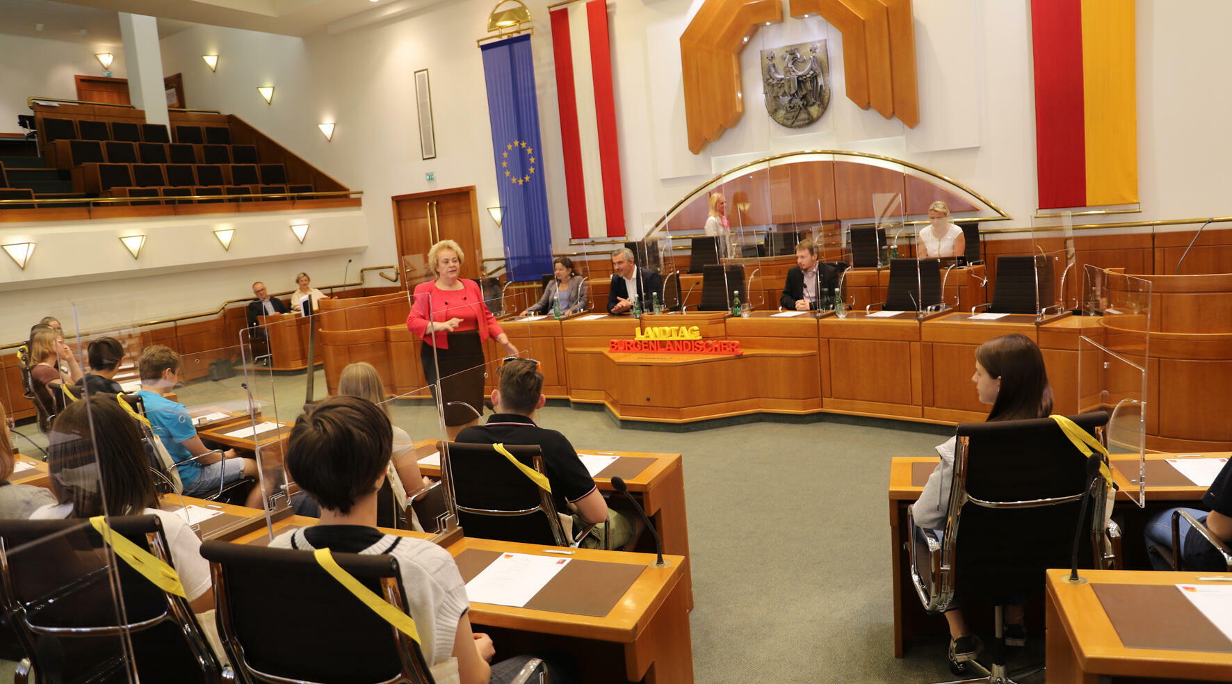 „Mit dem Jugendlandtag wird unser Landesparlament der Aufgabe gerecht, junge Menschen für Politik zu begeistern und zum Mitmachen zu animieren“, sagte Landtagspräsidentin Verena Dunst bei der Begrüßung. Im Anschluss daran stellten die Schülerinnen und Schüler der Landwirtschaftlichen Fachschule GüssingLandesrat Heinrich Dorner zahlreiche Fragen zu den Themen Verkehr (Verkehrsnetz, Verkehrsanbindungen, Bus- und Bahnverbindungen) und Sport.
