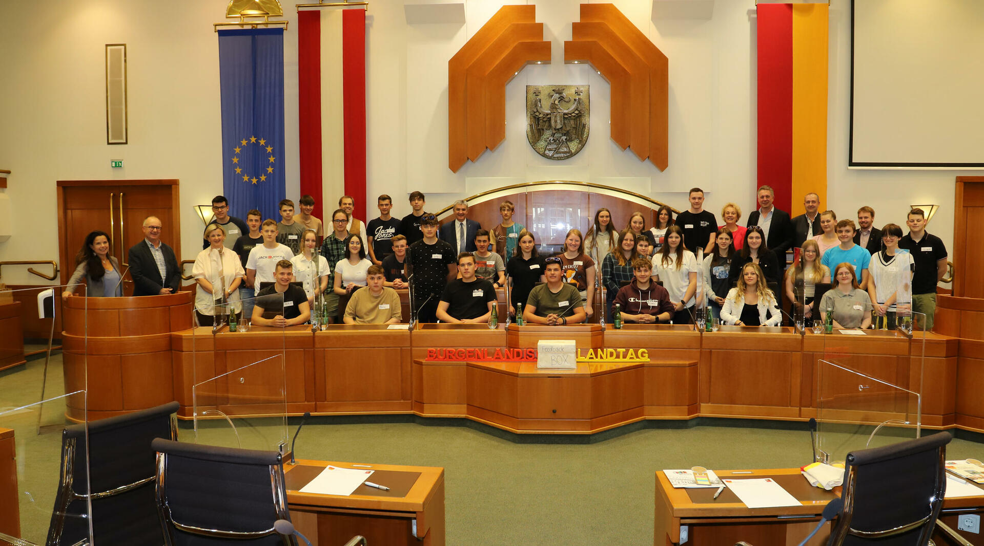 50 Schülerinnen und Schüler der Landwirtschaftlichen Fachschule (LFS) Güssing waren heute beim Projekt „Jugend im Landtag“ dabei und diskutierten gemeinsam mit Landesrat Mag. Heinrich Dorner und Landtagspräsidentin Verena Dunst über ihre Anliegen und eigenen Themen. Durch die Demokratieoffensive sollen die Jugendlichen für die politische Arbeit im Burgenland begeistert und zum Mitgestalten eingeladen werden. Landesrat Dorner stand den Schülerinnen und Schülern eine Stunde lang Rede und Antwort. Durch eine zweite Fragerunde – mit den Landtagsabgeordneten Gerhard Bachmann, Walter Temmel, MMag. Alexander Petschnig und Wolfgang Spitzmüller - führte DDr. Barbara Glück, die Leiterin der KZ-Gedenkstätte Mauthausen. Dabei stand das Thema Bio (Ökologisches System, Bio-Wende, Bio-Region, biologischer Landbau/Bewirtschaftung, Nachhaltigkeit, Kennzeichnungspflicht von Lebensmitteln) im Mittelpunkt. Im Vorfeld der Gespräche erhielten die heutigen „Jungabgeordneten“ eine Führung durch das Landhaus. Mit dabei war auch der Auslandsdiener des Jahres 2020, Jonathan Dorner.