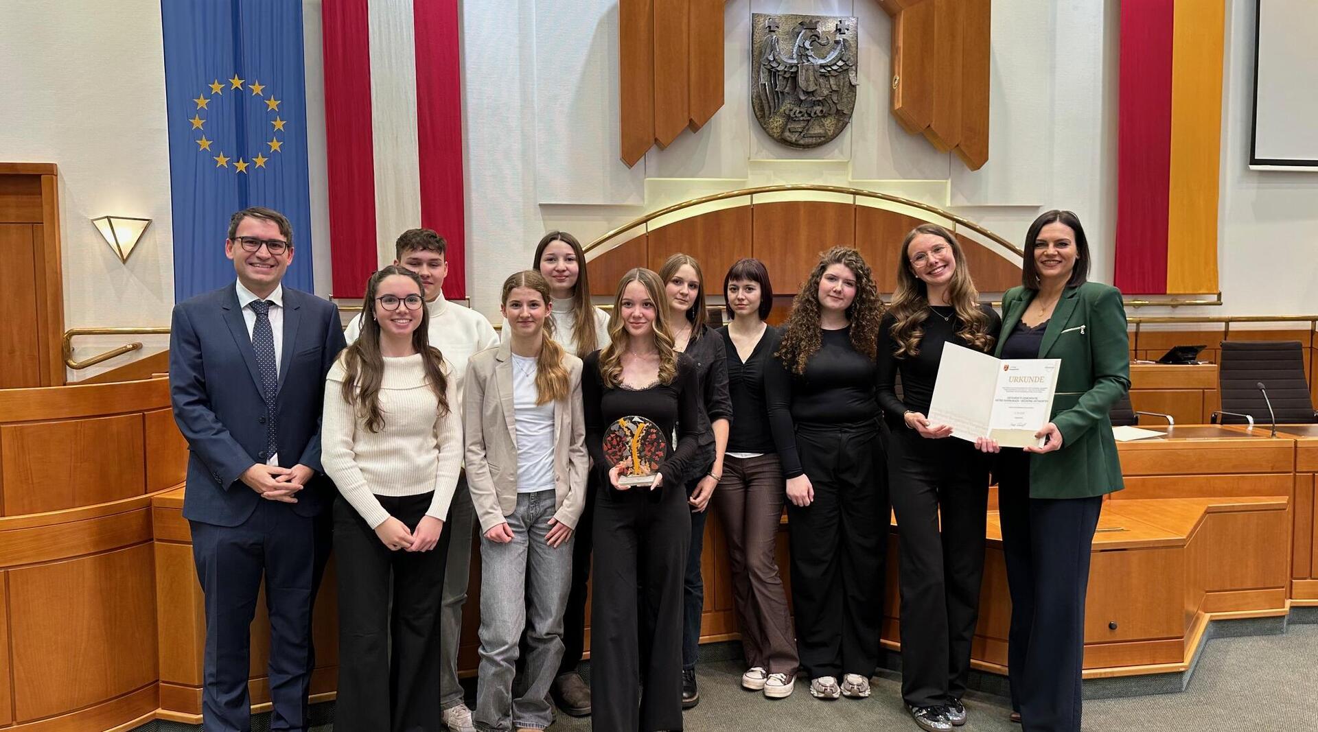 Platz 3: Landtagspräsidentin Mag.a Astrid Eisenkopf mit den Vertreterinnen und Vertretern der 5B Klasse des BG BRG BORG Oberpullendorf