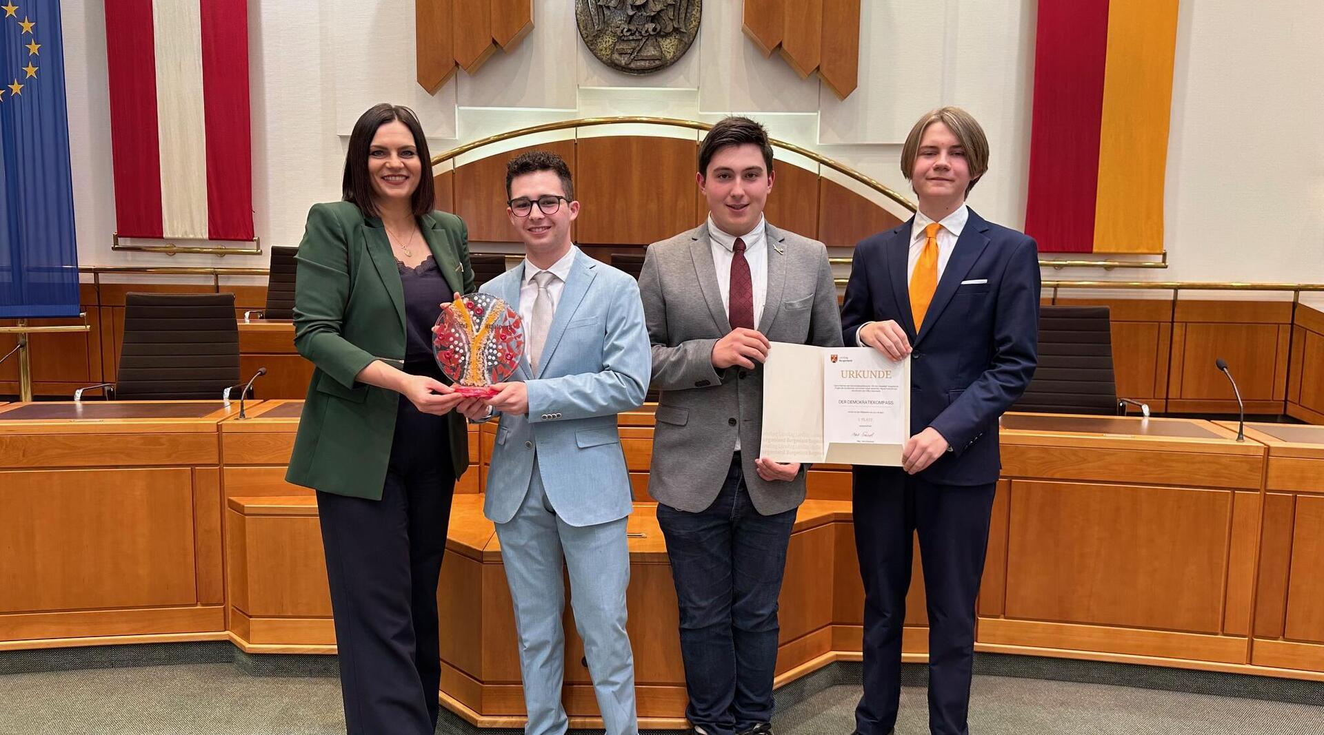 Platz 1: Landtagspräsidentin Mag.a Astrid Eisenkopf mit Fabian Jelleschitz, Pascal Kratochwil und Jens Brueren
