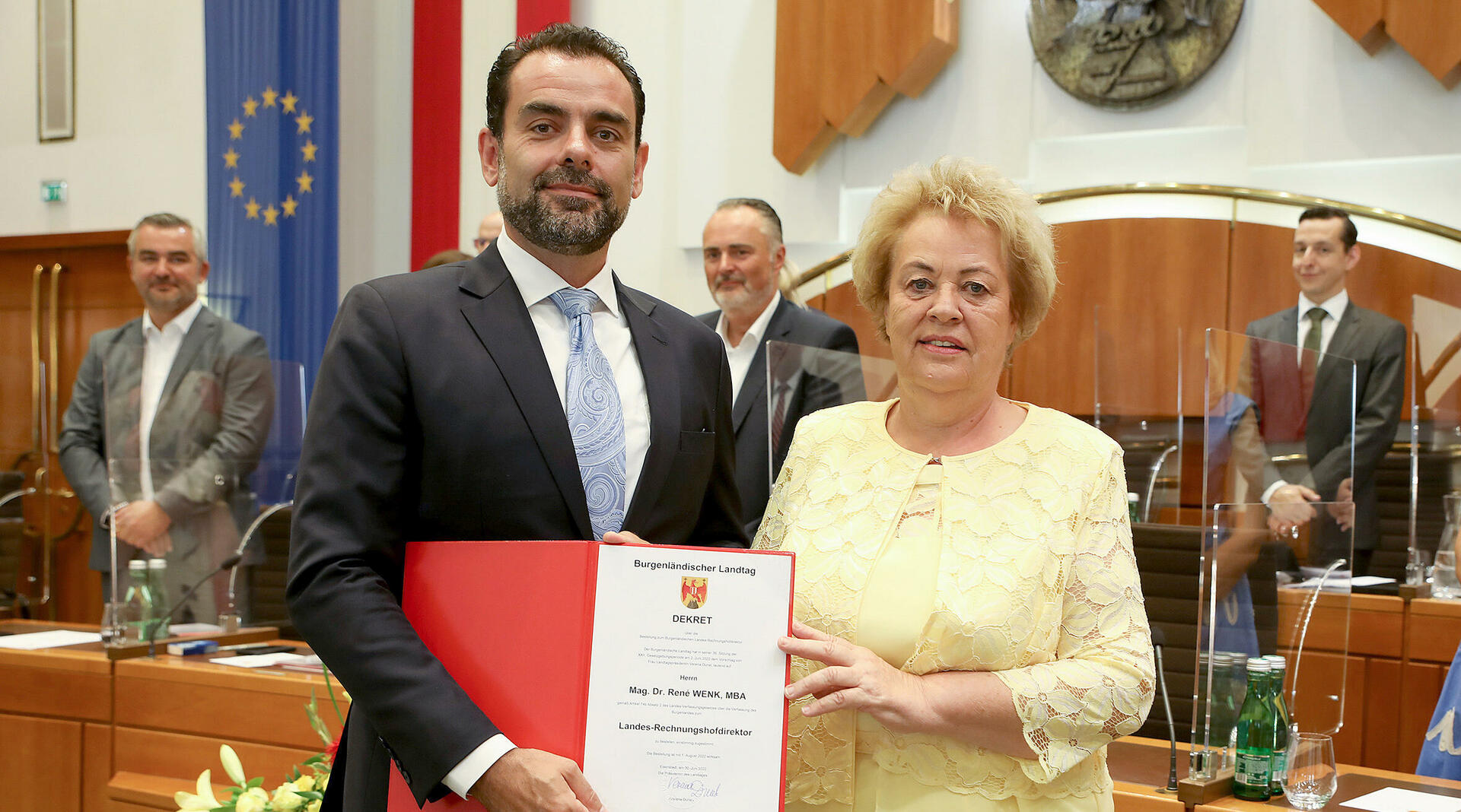 Eisenstadt, 30. 6. 2022. Im Rahmen eines Festaktes wurde Mag. Dr. René Wenk heute als neuer Landesrechnungshofdirektor durch Landtagspräsidentin Verena Dunst angelobt. „Ich freue mich, dass die Entscheidung für Mag. Dr. René Wenk einstimmig im Landtag gefallen ist und heiße ihn als neuen Landesrechnungshofdirektor herzlich Willkommen“, so Landtagspräsidentin Verena Dunst.